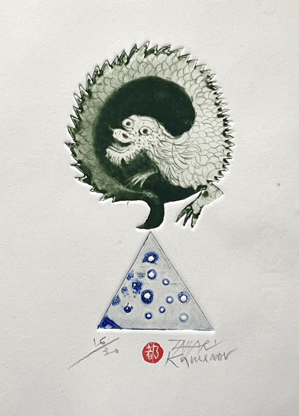 2. „Година на дракона“ – цена при запитване! От цикъла „Китайски календар“. Година: – Техника: графика- преге/дълбок печат. Подпис: да. Размер в паспарту: 23 х 19,50см. Размер с рамка: 42 х 32 см. Състояние: отлично! Светлосенките са от стъклото! Категории: Автори, Графика, Захари Каменов Свързани продукти Георги Баев/Графика1. Рибар – архив! Още Графика/Стоян ЦаневВидение – архив! Още Графика/Онник КаранфилянНощ на морския бряг – архив! Още