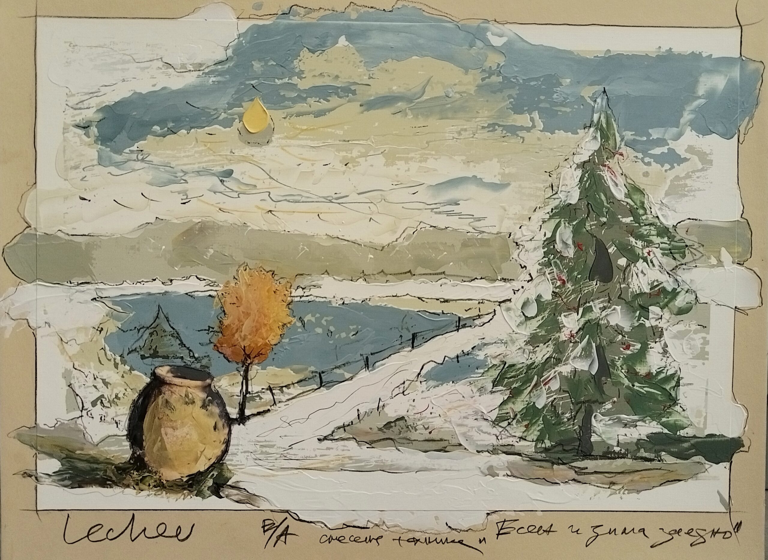 4. „Есен и зима заедно“1000,00 € „Есен изима заедно“. Около 2022 г. Техника: Смесена – маслени бои, молив. Подписана. Размер: 45 х 55 см. Размер с рамка: 53 х 63 см. Подарък: албум на художника! количество за 4. "Есен и зима заедно" Добавяне в количката Изпрати запитване Категория: Живопис Свързани продукти Вергиния Паскалева/ЖивописОрхидея – архив! Живопис/Иван Нинов2. Портрет на младо момиче 350,00 € Живопис/Милчо СпасовМорски пейзаж – архив!